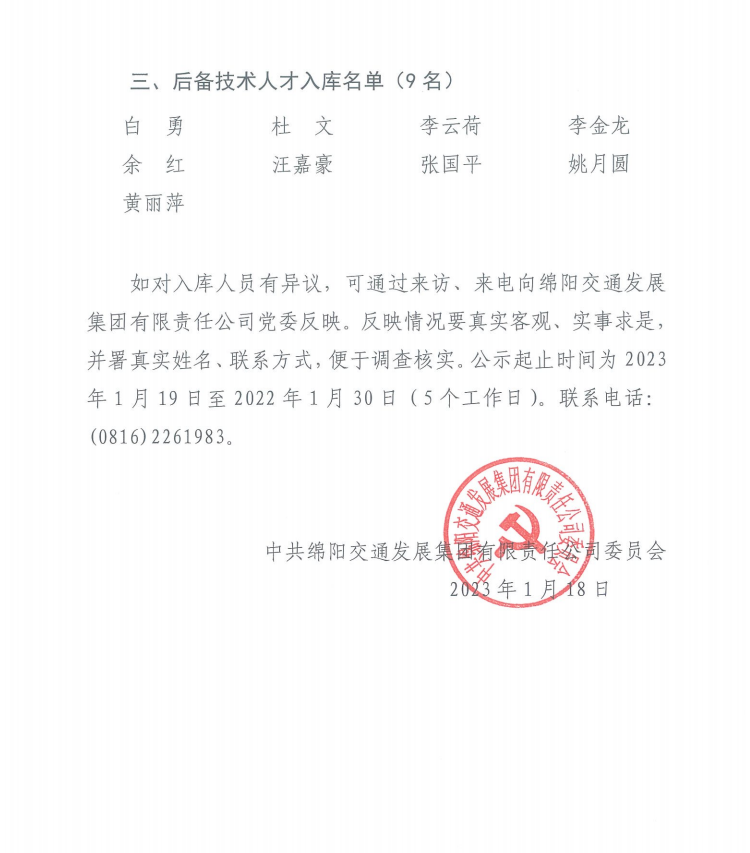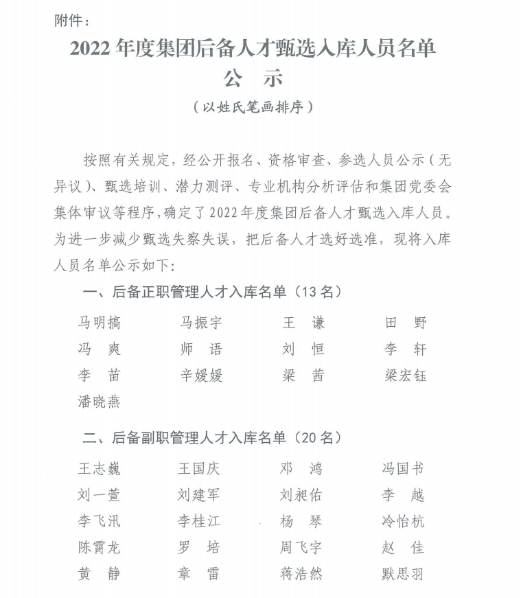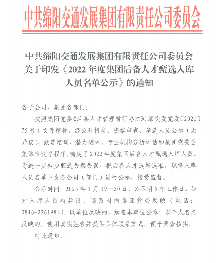 中共綿陽交通發(fā)展集團(tuán)有限責(zé)任公司委員會(huì)關(guān)于印發(fā)《2022年度集團(tuán)后備人才甄選人庫人員名單公示》的通知